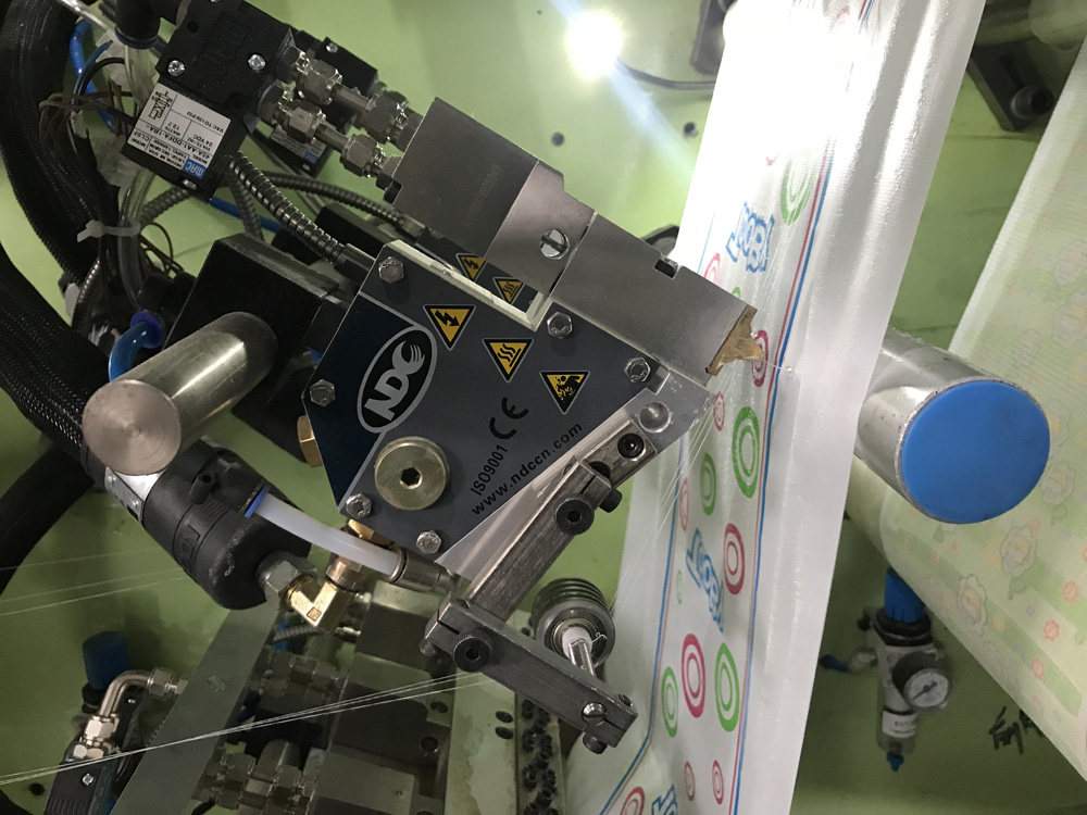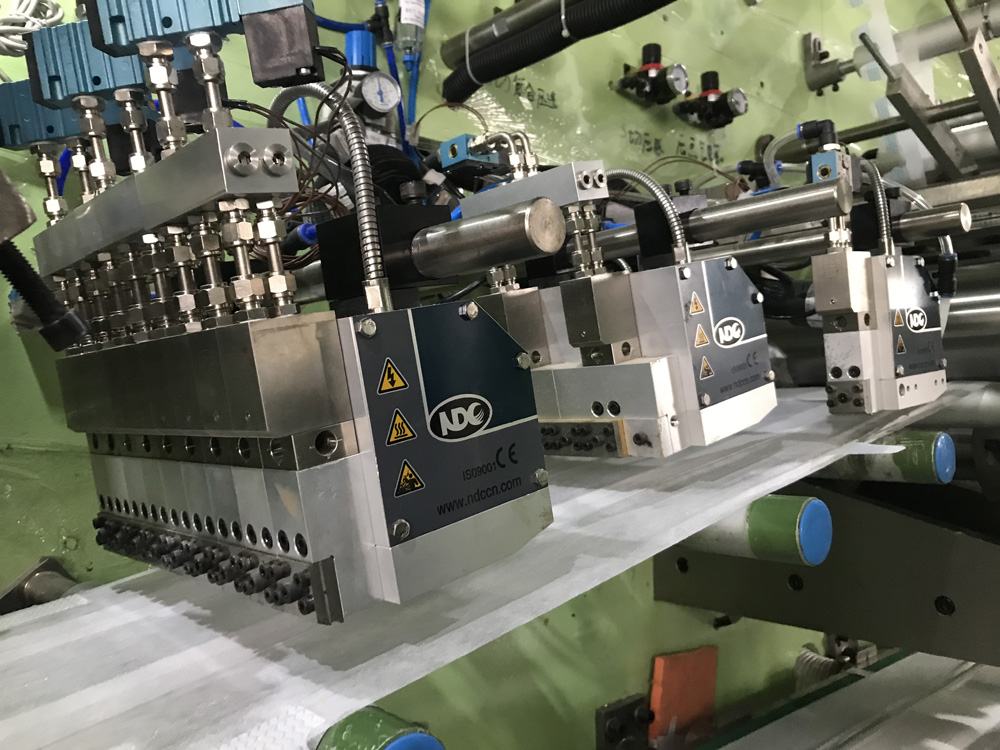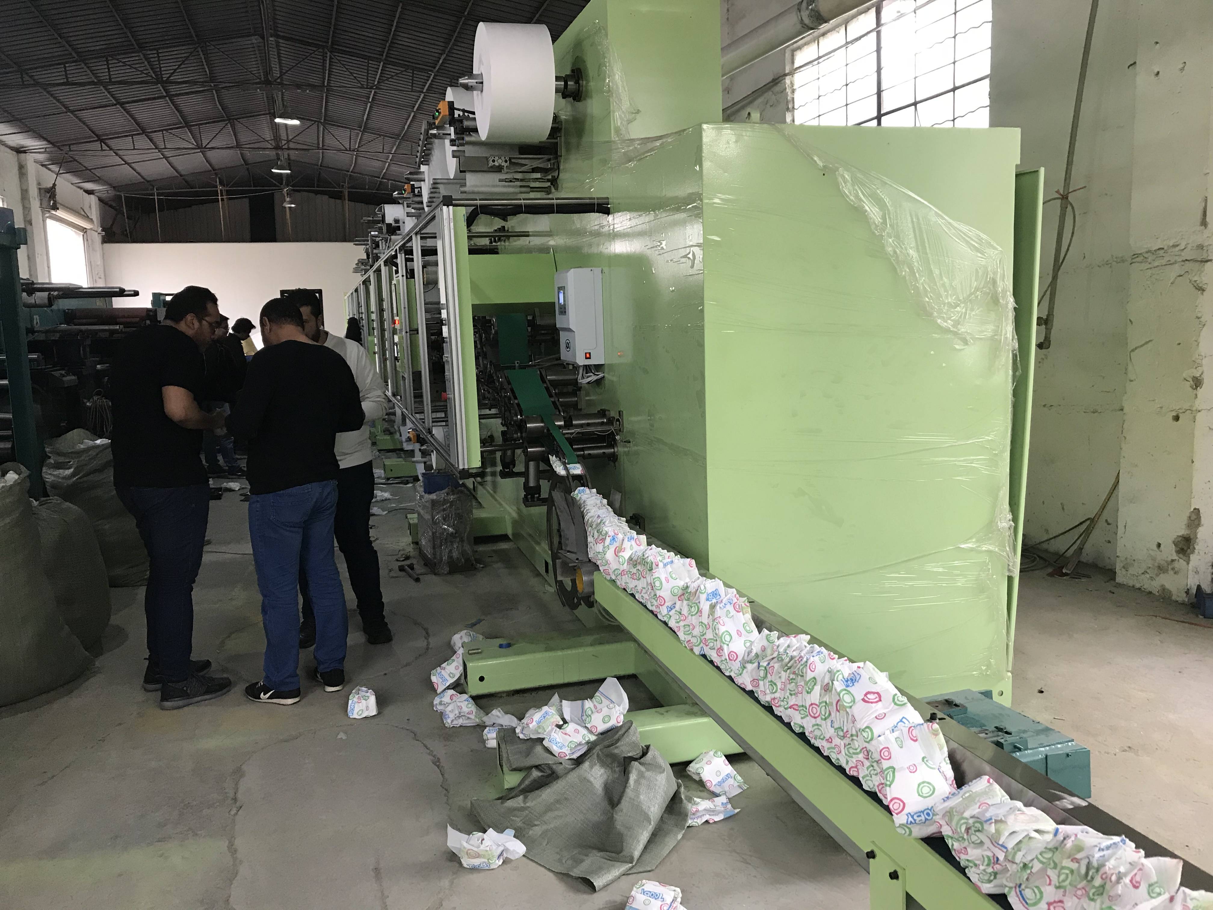 产品一次性自动完成T字形婴儿纸尿裤生产,只需挂上所需原材料,其余生产步骤由设备自动完成,原材料自动换接料,无需设备减速可完成材料换接,进口检测系统,可剔除原材料接头。设备由可编程控制器PLC控制大功率三相电机连结主轴驱动,通过相位控制使原材料复合到对应位置,部分材料例如大耳朵等采用伺服电机驱动,对照位置准确。采用高精确度热熔胶喷胶系统,节约热熔胶材料,材料复合强度高。可生产S,M,L,XL四种型号纸尿裤。